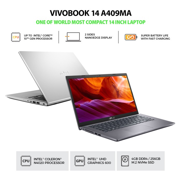 ASUS VivoBook 14 A409MA-VIPS422 – Slate Grey [Intel Celeron N4020 / UMA / 4G / SSD 256G+HOUSING / V-IPS / 14inch / Win10 / OHS]